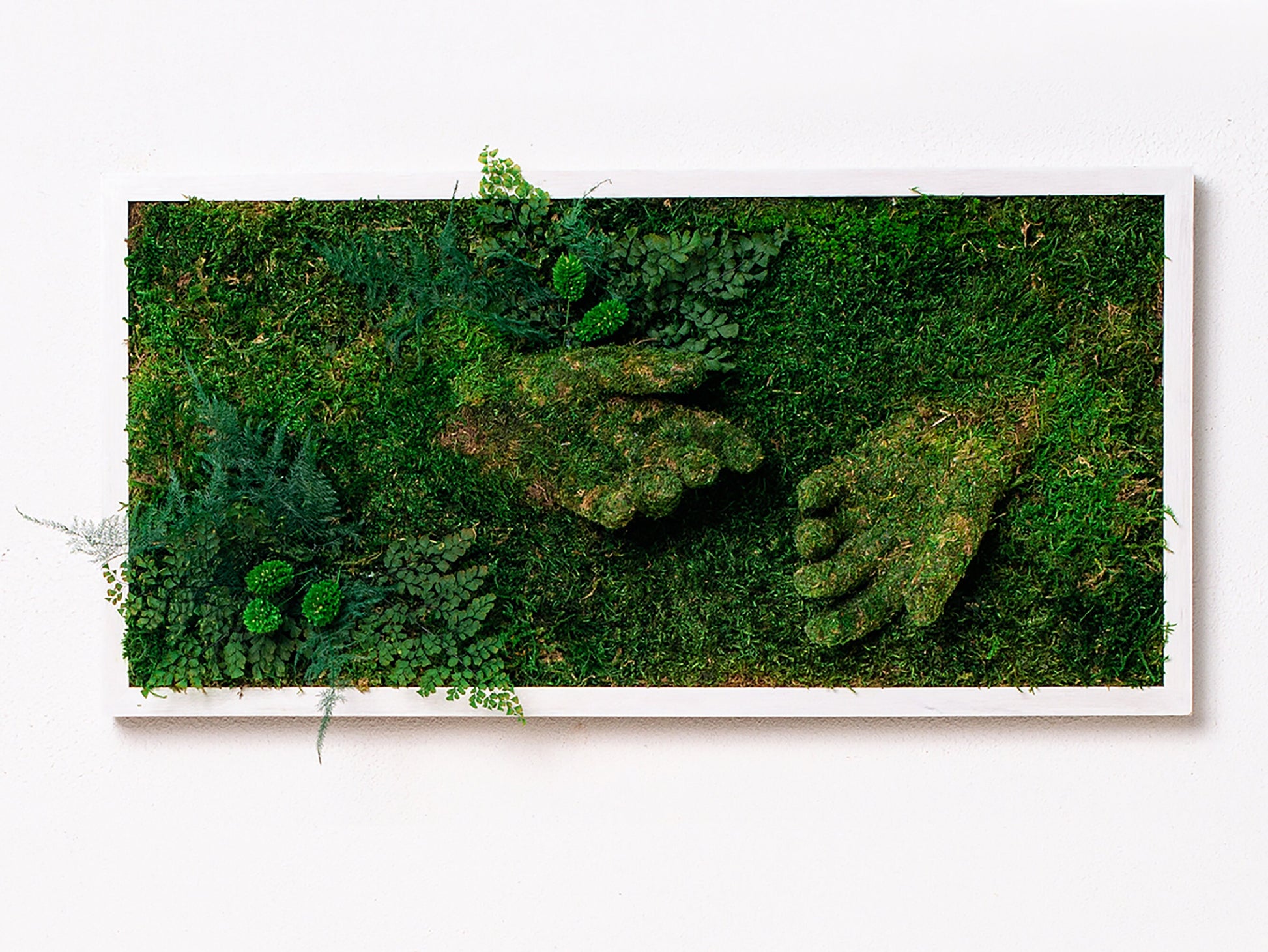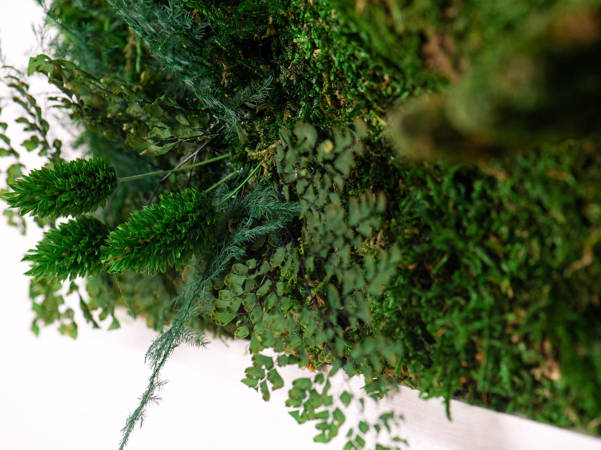 Complementing the moss is the addition of live plants, adding a touch of variety and depth to the wall art. These natural plants are carefully chosen to complement the moss and to create a harmonious and balanced composition.